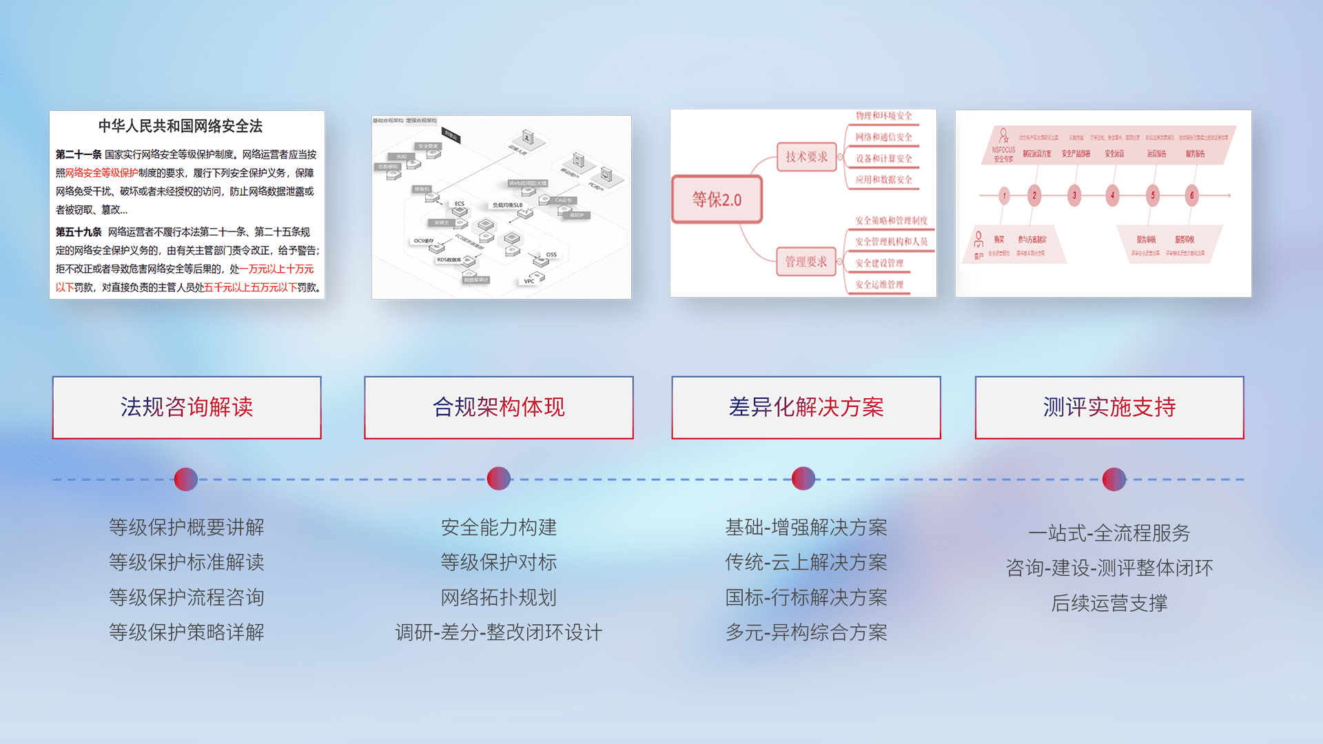 通过专业的法律咨询解读、、合规架构体现、、、、差异化解决方案、、、、测试实施支持等服务,,,为客户量身打造等保合规体系。。。
